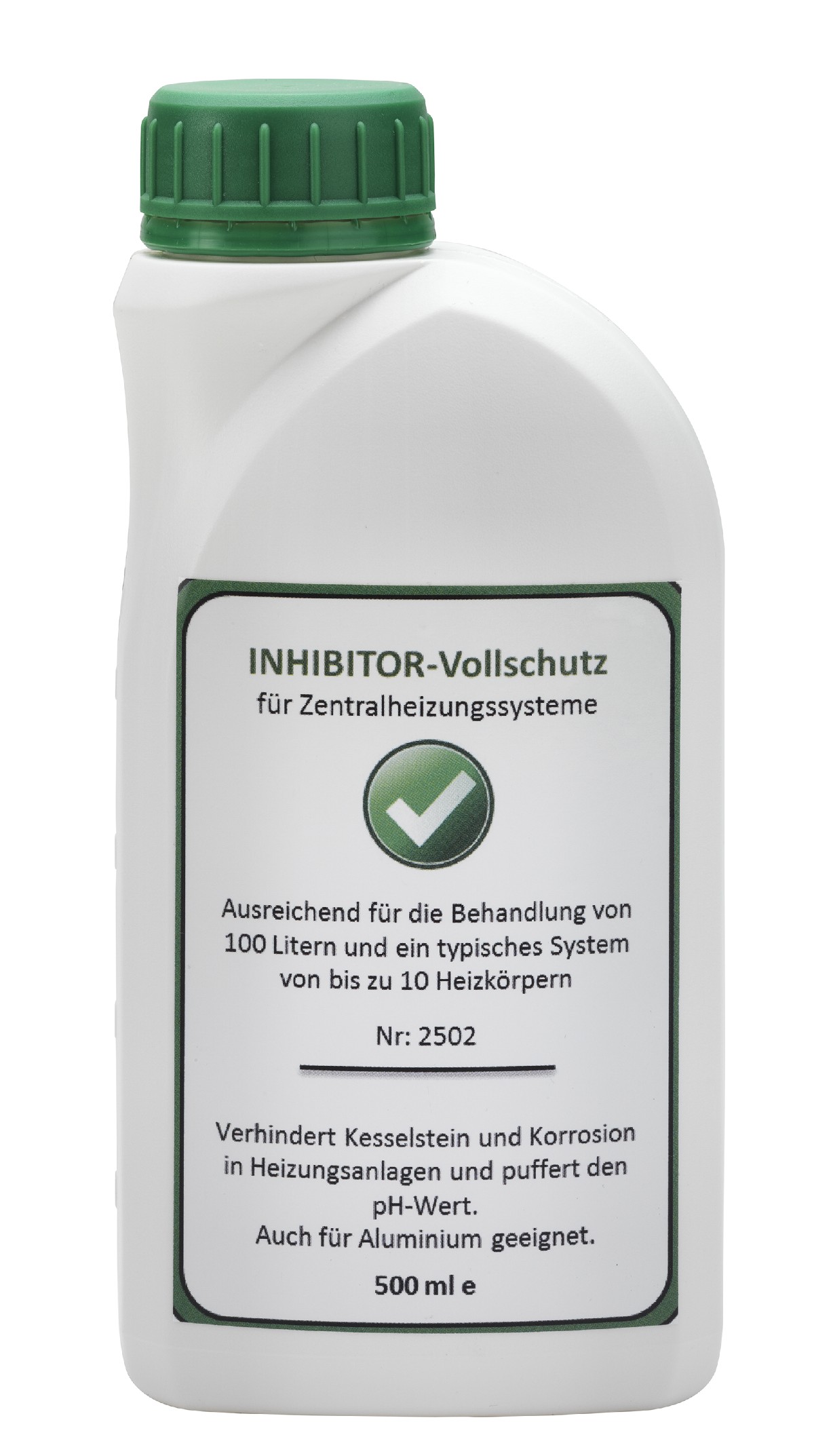 Inhibitor-Vollschutz mit pH-Puffer Um die Heizungsanlage optimal und nachhaltig zu schützen, kann der "Inhibitor-Vollschutz" eingefüllt werden. Schützt und stabilisiert sicher das Heizungswasser, speziell auch für Aluminiumbauteile. 500 ml für 100 l Heizungswasser. | |